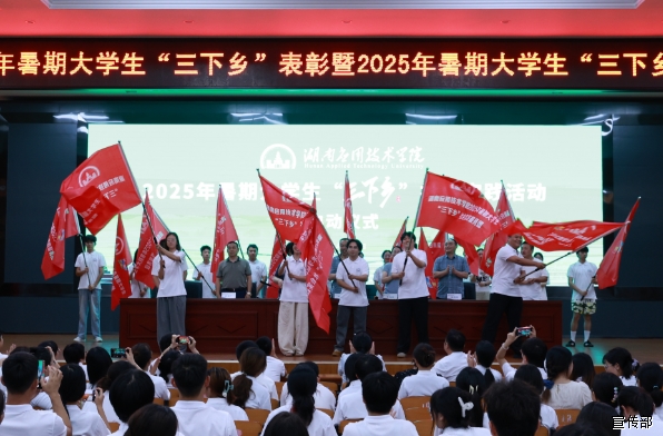 出征仪式上,学校党委副书记、纪委书记严曙光,党委委员、副校长丁春茹等人为实践队伍授旗。师生们接过旗帜,不断挥舞,表示将在乡野间淬炼青春,展现湖应青年的时代担当。