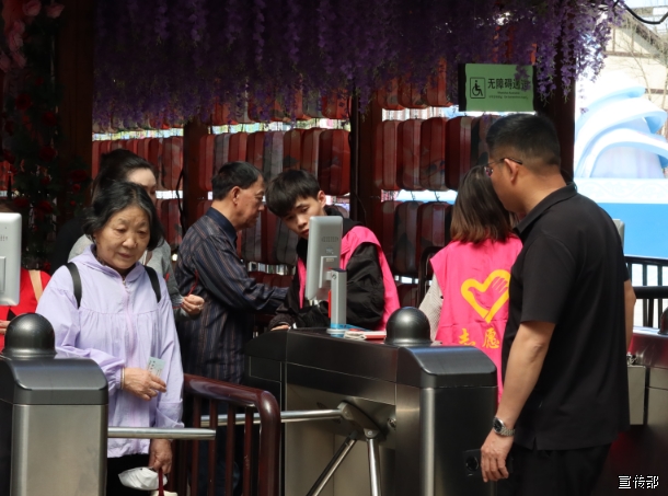 在桃花源景区,志愿者们身穿志愿服,向游客发放文明旅游宣传手册,为游客提供扫码入园、路线指引、旅游咨询等服务,共同维护现场秩序,引导游客们文明旅游。志愿者们还结合当地的民俗特色和本土文化,开展传统非遗文化活动,活动吸引了更多的游客前来打卡和观赏。本次志愿服务活动中,志愿者们以最饱满的热情、最贴心的服务,迎送一批又一批的游客,确保游客有一个良好的旅行体验。